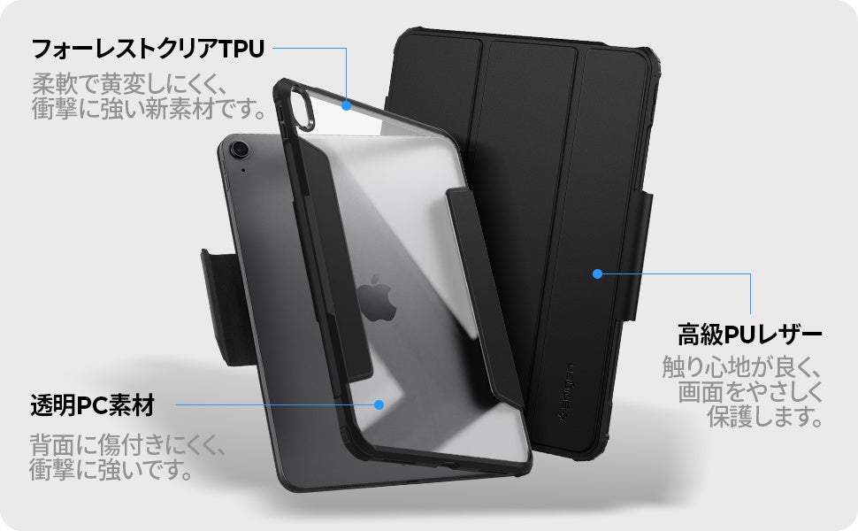 前面にはiPad Air 5/ 4の色と似合う三角折りスタンド機能付きのレザーカバー、裏面にはクリアな透明PC素材を使用してiPad Air 4のデザインをいつでも楽しめます。