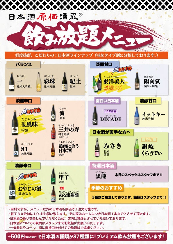 ・お1人様+¥500で日本酒が35種となるプレミアム飲み放題へアップグレード可能です。