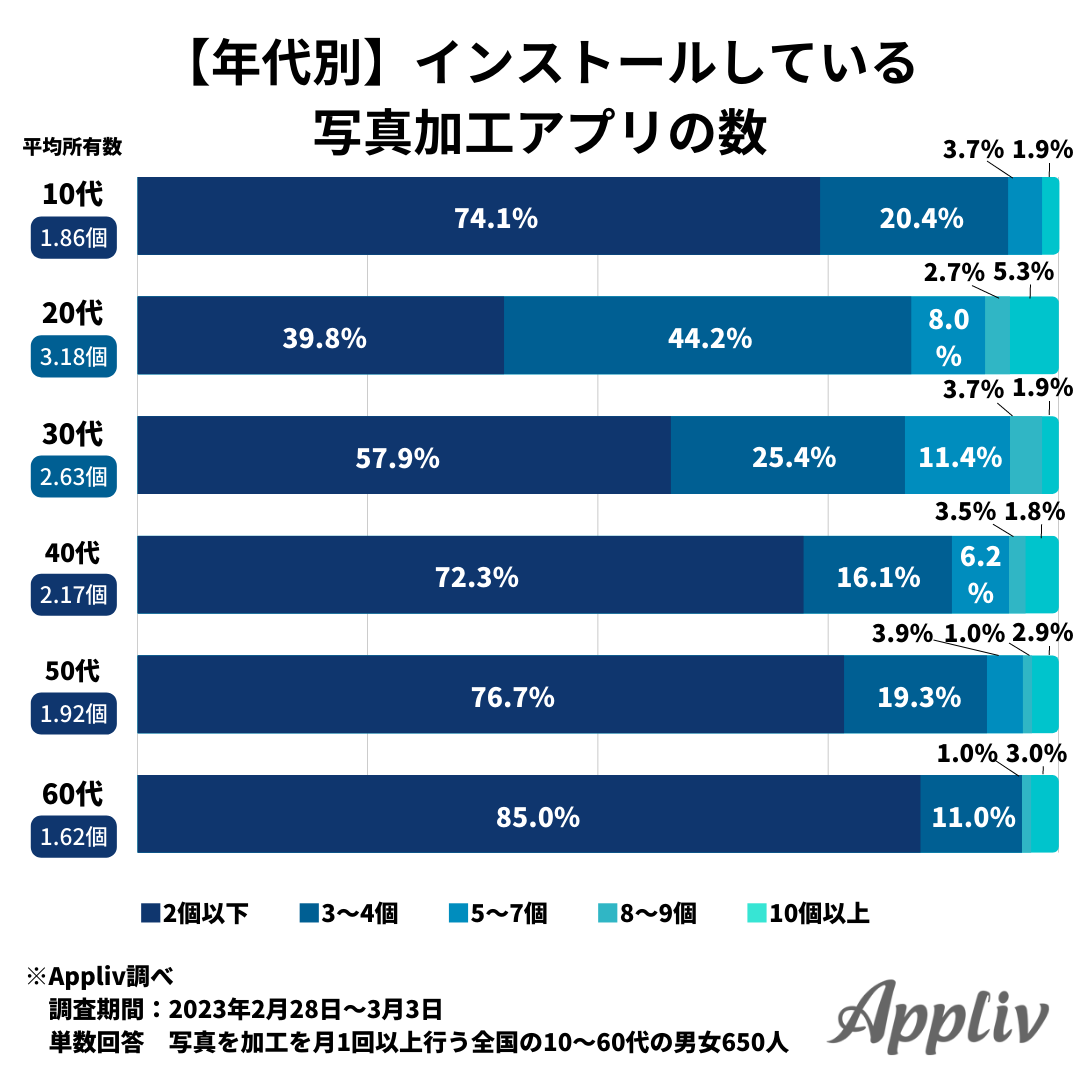 調査結果によると、写真加工の頻度が最も高かった世代は10~20代。主にSNSへの投稿を目的として、自撮りや自分の写った人物写真を加工している傾向にあります。特に20代は平均3個の写真加工アプリを利用しており、その積極性が見てとれます。
