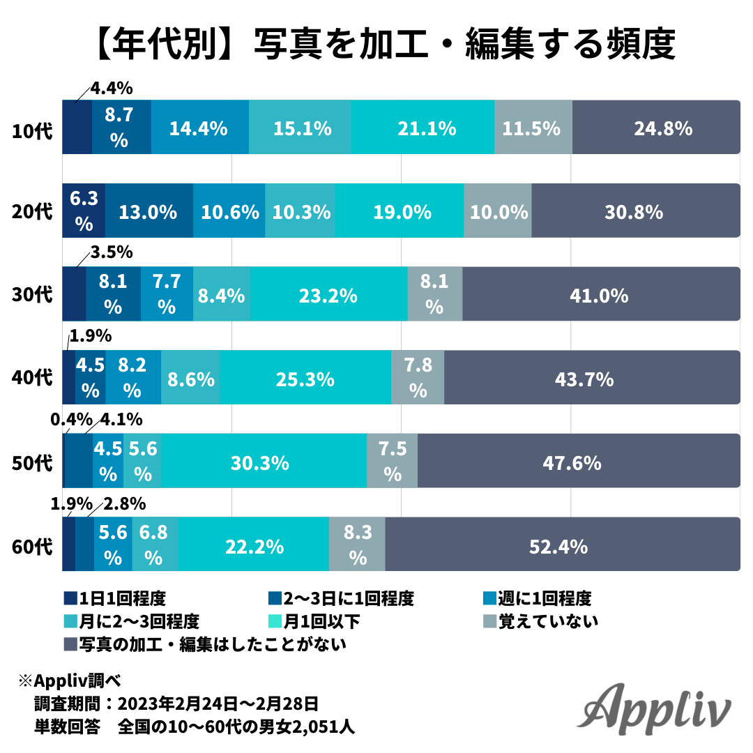 スマホの普及にともない、写真加工アプリは世代を問わず広がっています。とはいえ、若者のあいだでは写真・動画投稿SNSが日常に定着しているのに対し、中高年のあいだではSNSの利用が限られているなど、加工された写真の使われ方には年代により差がある印象も。Applivでは全国の10~60代の男女にアンケートを実施。写真の加工を行う頻度や、使っている写真加工アプリについて調査しました。