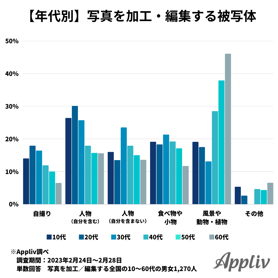 - アプリで加工する被写体、10~30代が4割近くが「自撮り」または「人物(自分を含む)」