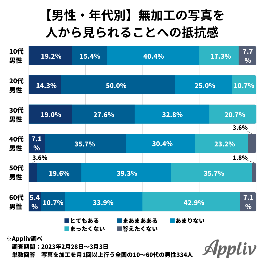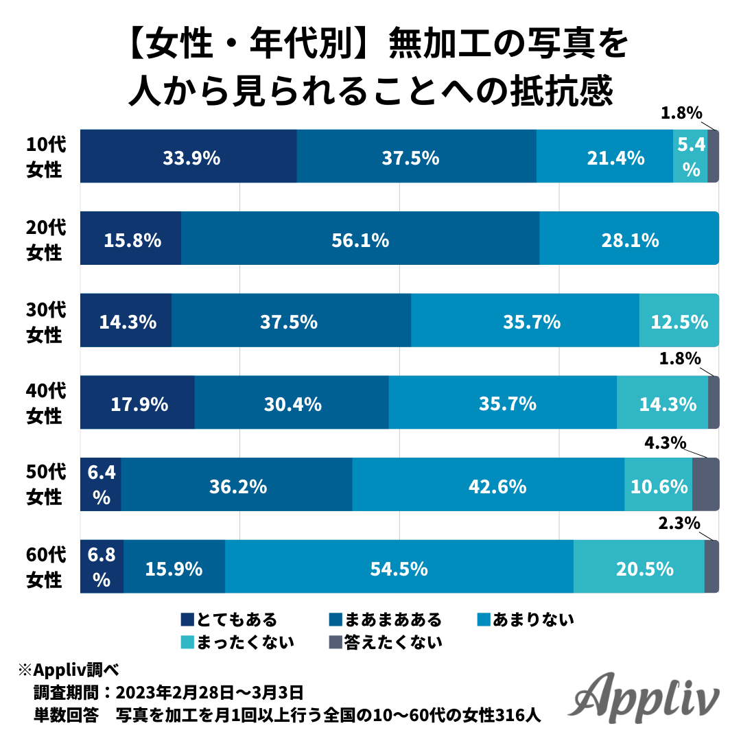 【写真加工アプリ】10代女性の33.9%が無加工の写真を見られることに抵抗が「とてもある」、60代女性の5倍以上(Appliv調べ)