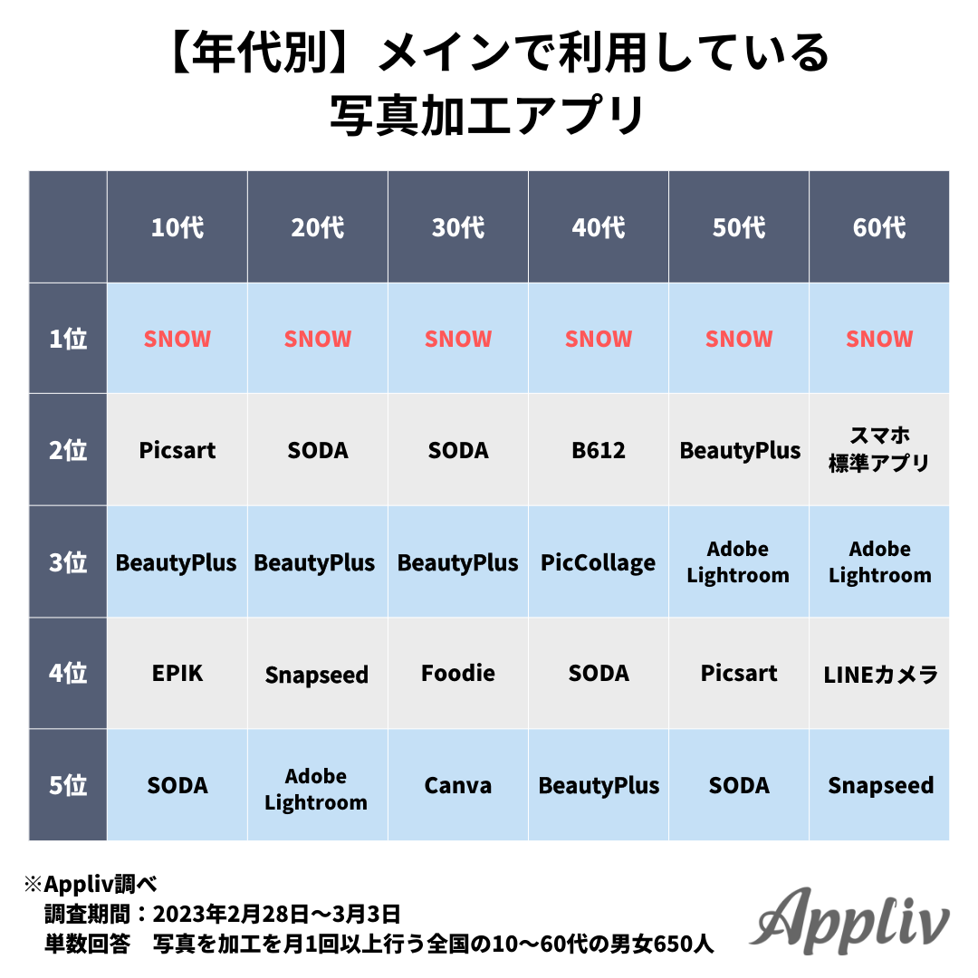 - メインで利用している写真加工アプリは全世代で『SNOW』が1位