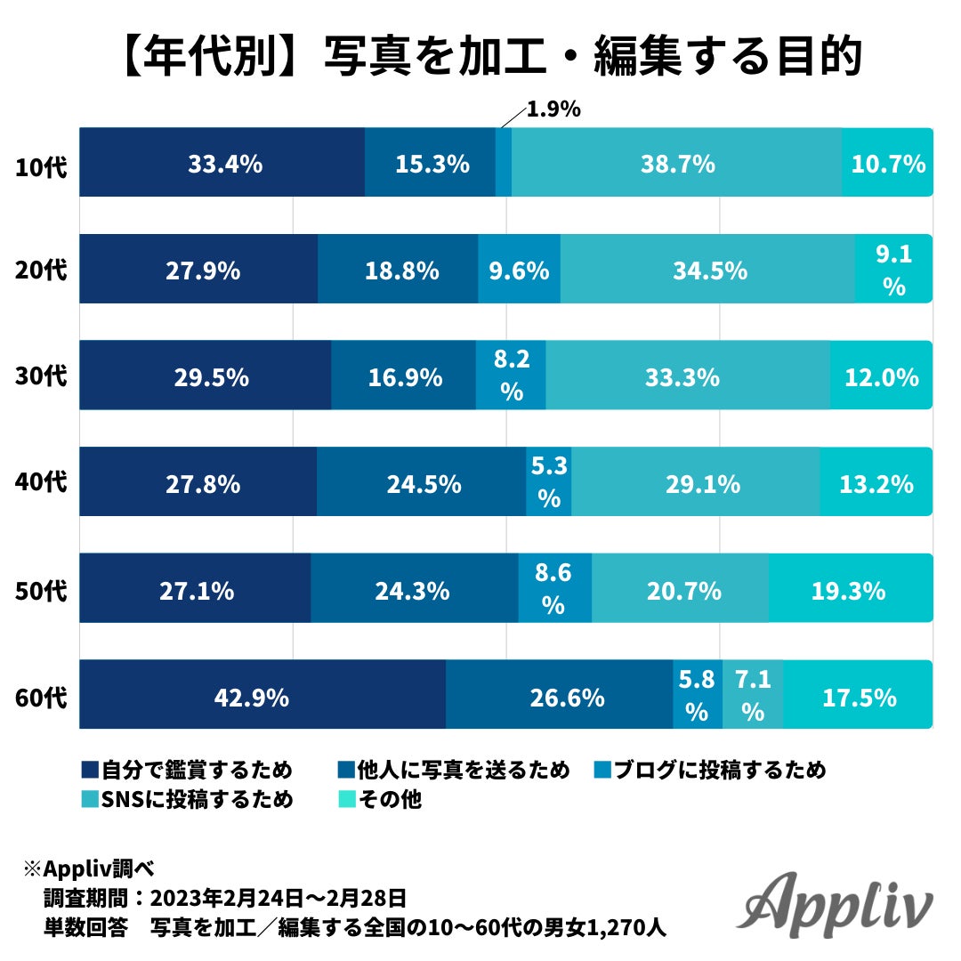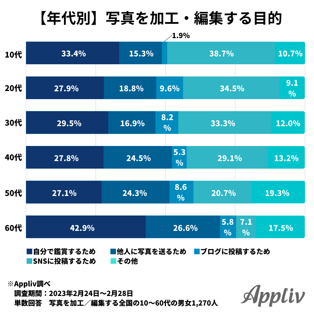 写真を編集・加工する目的については、10~40代で「SNSに投稿するため」が1位という結果に。特に10代は38.7%と最多で、これは60代(7.1%)の5倍以上にあたります。