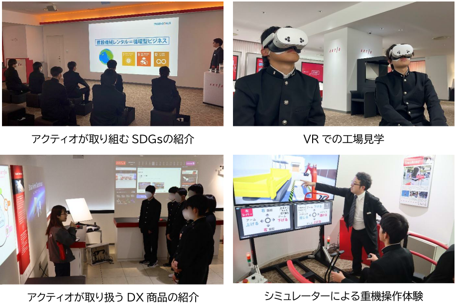 当日の学習プログラムでは、まず建設機械レンタル業界の役割やアクティオの事業についてレクチャーを行いました。続いて、VRを用いた工場見学や、安全教育VRによる建設現場の事故疑似体験を実施。さらに、シミュレーターによる重機操作体験や、アクティオが推進するDXの取り組みを紹介しました。