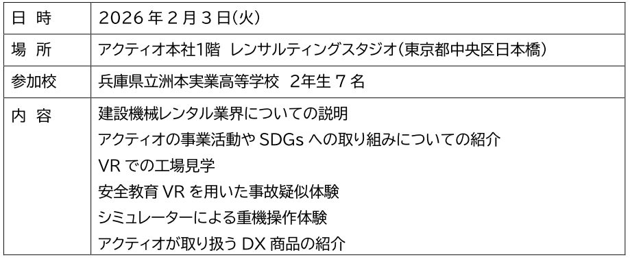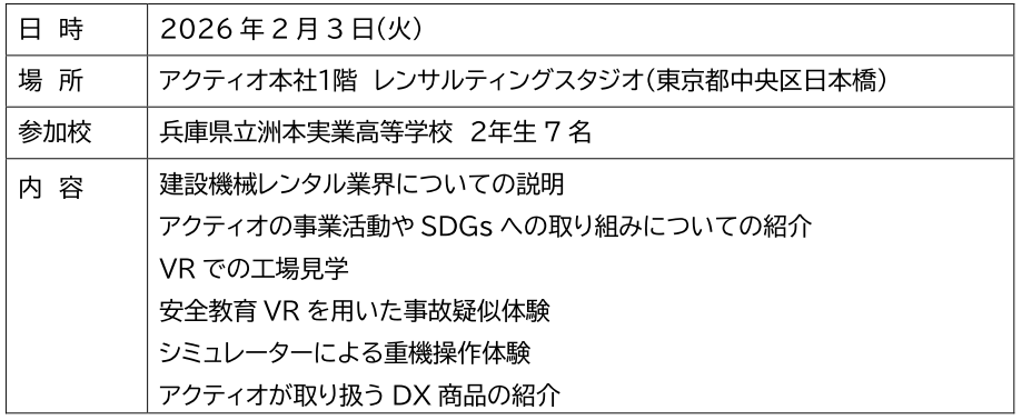 総合建設機械レンタルの株式会社アクティオ(本社:東京都中央区日本橋、代表取締役社長兼COO:小沼直人、以下アクティオ)は、次世代を担う若者へのキャリア教育支援の一環として、2026年2月3日(火)に本社1階のレンサルティングスタジオで兵庫県立洲本実業高等学校の生徒7名の企業訪問学習の受け入れを実施しました。