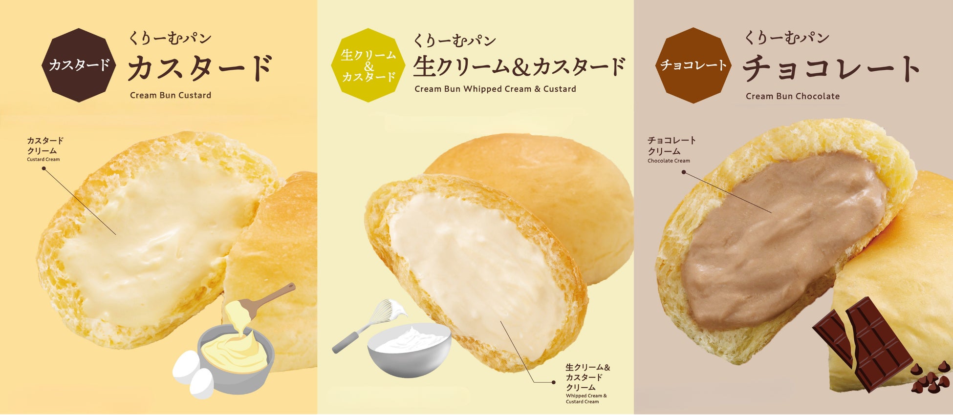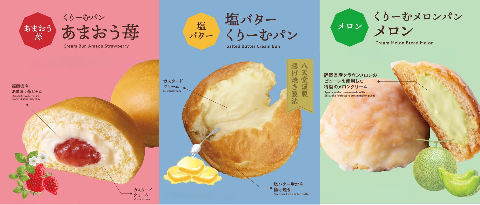 定番のフレーバー(カスタード・生クリーム&カスタード・チョコレート・あまおう苺)に加え、甘じょっぱい味わいで人気の「塩バターくりーむパン」とサクッと生地と静岡県産クラウンメロンのピューレを使用したクリームを楽しめる「くりーむメロンパン メロン」をラインアップ。