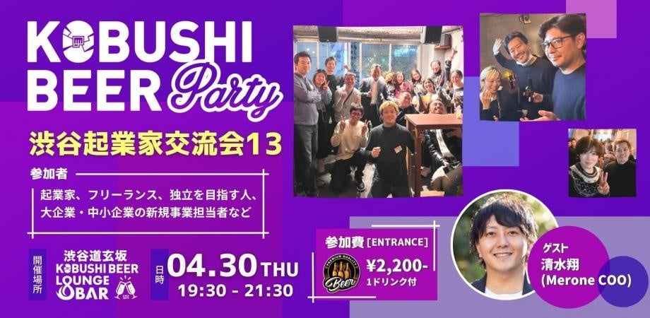 KOBUSHI MARKETING合同会社(東京都渋谷区、代表:井上裕介)が運営する渋谷道玄坂の『KOBUSHI BEER LOUNGE & BAR』では、人と人とを繋ぐユニークな取り組みを行い多くのビジネスチャンスを生み出している。そして今回、株式会社Merone COO 清水翔氏をゲストに迎え、2026年4月30日(木)19:30~起業家として活躍中の方、フリーランスとして独立をされた方、将来サラリーマンからの独立を考えている方が集まる交流イベントを開催すると発表した。