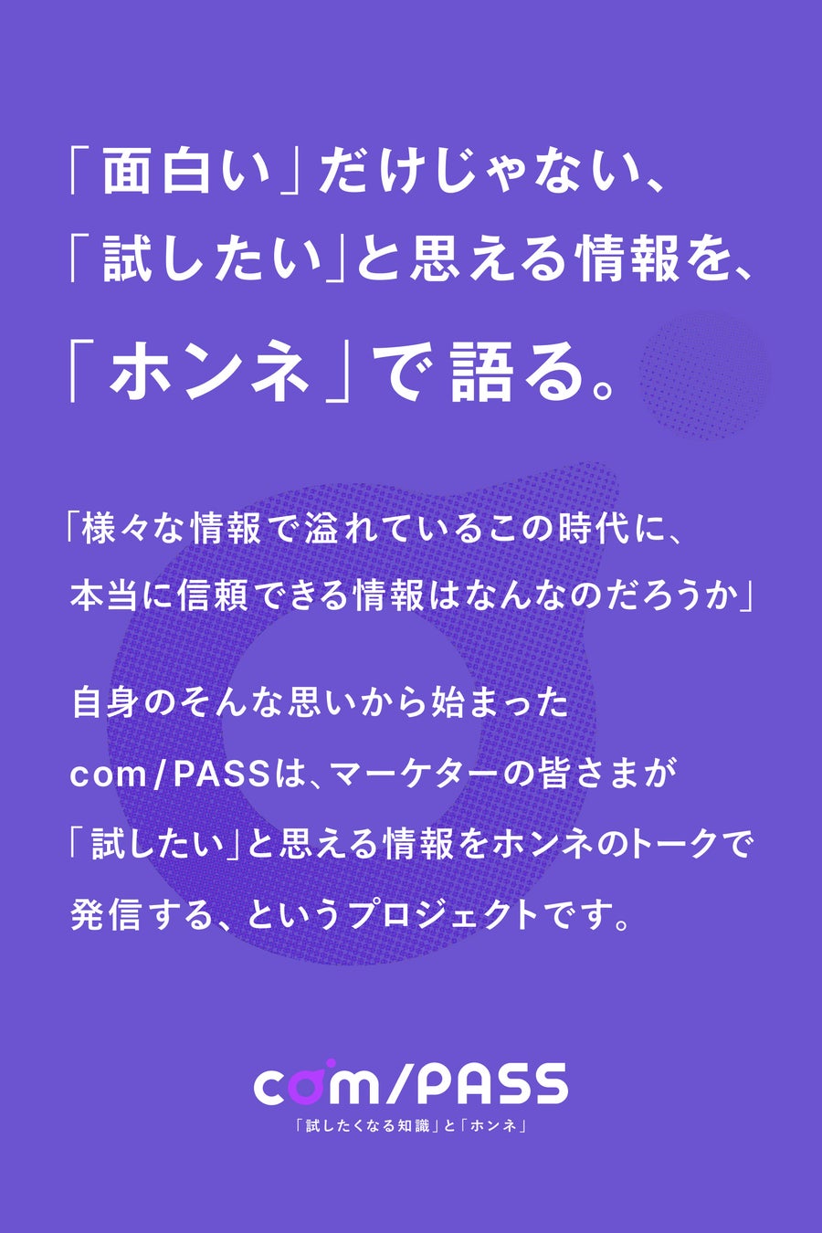 「com/PASS」という名前には、マーケターの道しるべ(羅針盤)として、共に「com」新しい領域への突破口「PASS」を切り開くという想いが込められています。