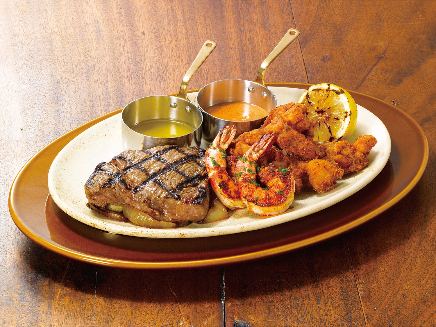「300gブラックアンガスステーキ」は、ロイヤルグループの企画・開発担当者らがアメリカに足を運び選定した「ブラックアンガスビーフ」に、ニンニク、はちみつ、醤油、オリーブオイルを使った特製オイルを塗り込み、厚切りにして香ばしく焼き上げました。本場のステーキハウスさながら、2種から選べるサイドメニュー付きでご用意。また、トマトベースに玉ねぎ・セロリ・ニンニクといった香味野菜を加え、チリパウダーなどのスパイスを効かせた「チキンジャンバラヤ」は、海老のグリル3尾とオニオンリング、フィンガーチキンをのせたボリューム満点な一皿です。