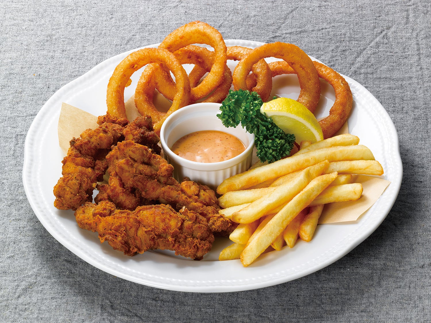 ハーブとスパイスが香るフィンガーチキンと、衣にビールを使用したオニオンリングのフライ、フライドポテトを盛り合わせたアペタイザー。マヨネーズやケチャップ、スパイスなどを合わせたディップソースにつけてお召し上がりください。