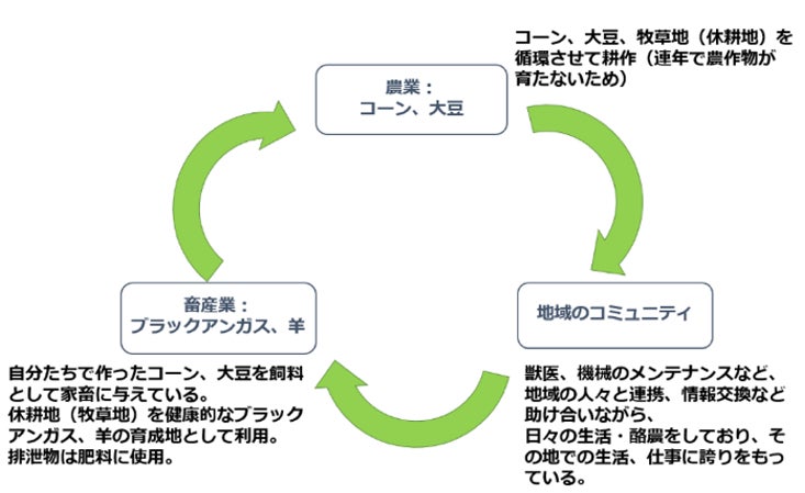 収穫後廃棄されていた農作物の一部を家畜のえさとして使用し、さらに家畜の堆肥を利用し農作物を育てるといった、資源を無駄なく循環させながら農畜産物を生産する環境に配慮した持続性のある仕組みです。