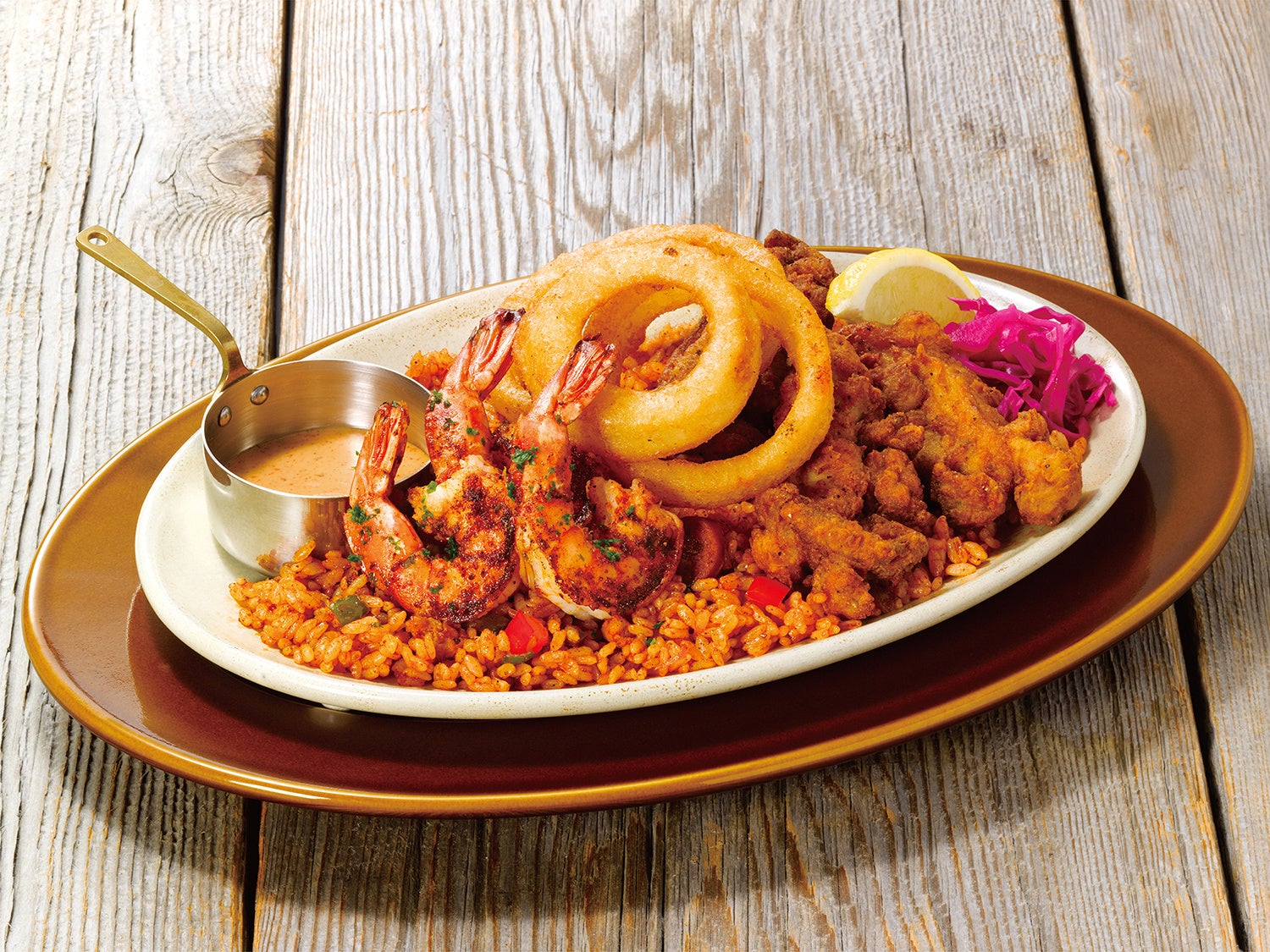 スパイシーなジャンバラヤに海老のグリル3尾とオニオンリング、フィンガーチキンをのせたボリューム満点な一皿。トマトをベースに玉ねぎ・セロリ・ニンニクといった香味野菜、チリパウダーなどのスパイス、唐辛子入りソーセージも入ったソースと、パプリカ・ピーマンをジャンバラヤライスと炒めて仕上げました。お好みでレモンを絞ってお召し上がりください。
