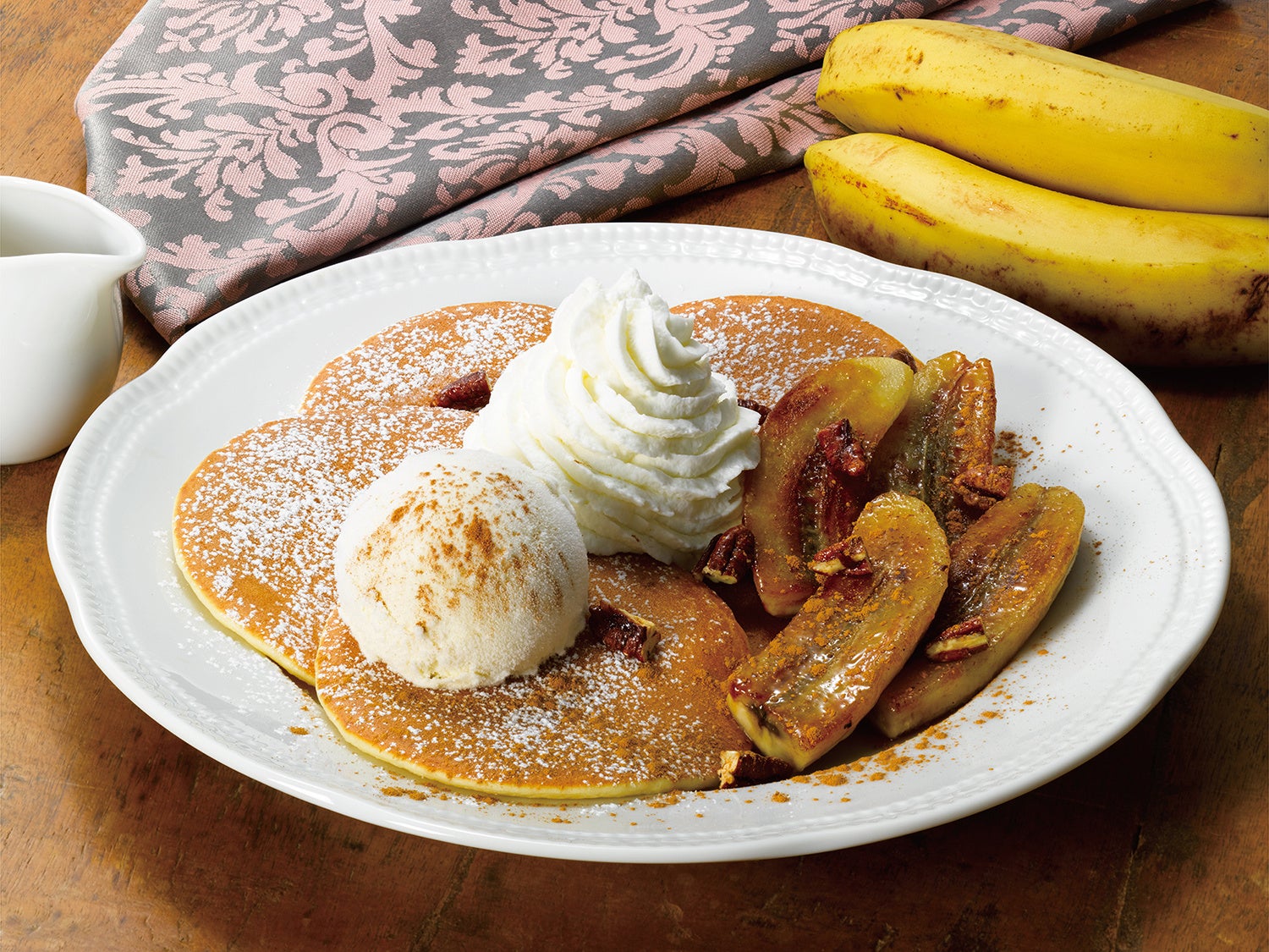 小さめのパンケーキ(5枚)をバターソテーしキャラメリゼしたバナナ、バニラアイスクリームと組み合わせたボリュームたっぷりのデザート。甘くてほろ苦いバナナとシナモン、パンケーキの相性は抜群です。トロッと温かいシロップは香りが立ってパンケーキにも良く馴染み、更に美味しくお召し上がりいただけます。