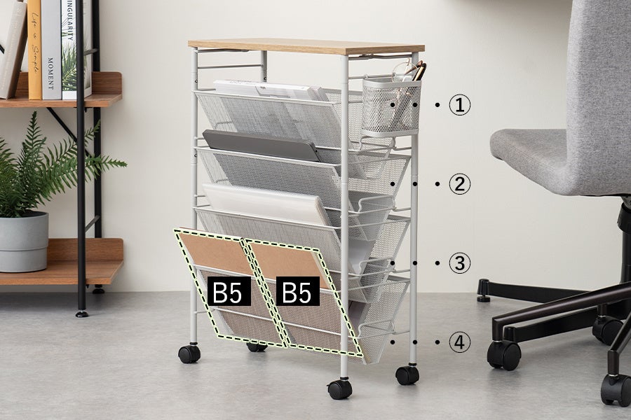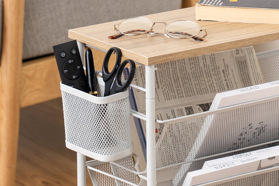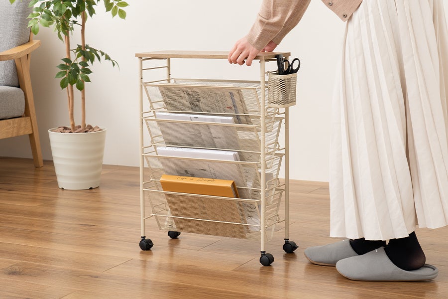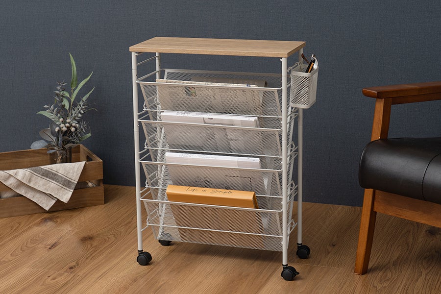 スリムタイプのラックを隙間に置けば収納に早変わり。大量の本や雑誌をひとまとめできる丈夫なスチール製を採用し、メッシュラックが生活感をカバー。