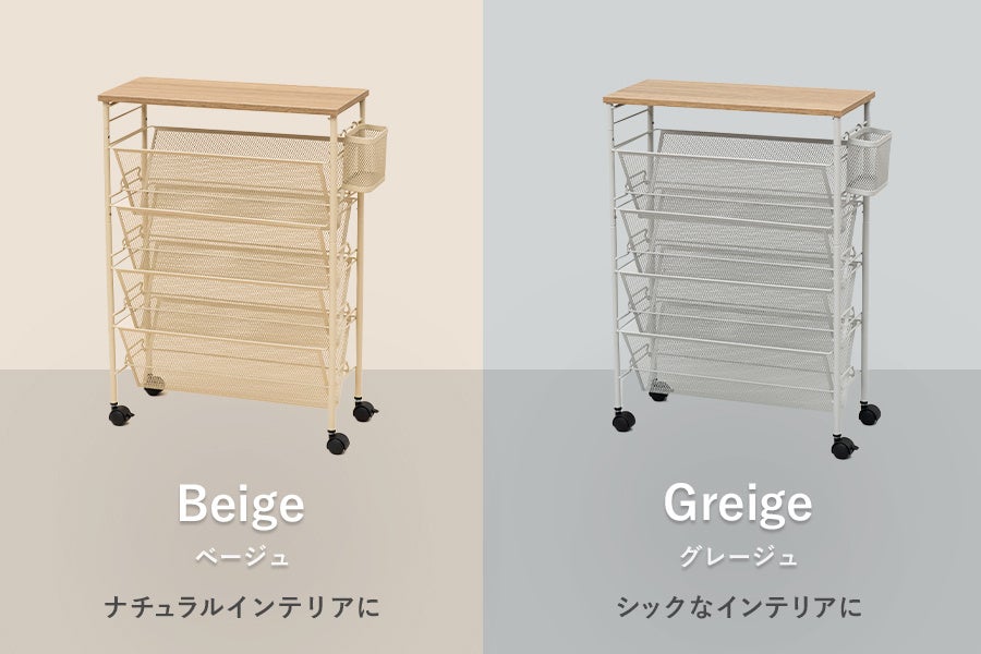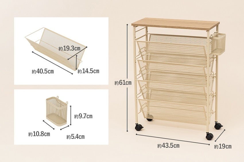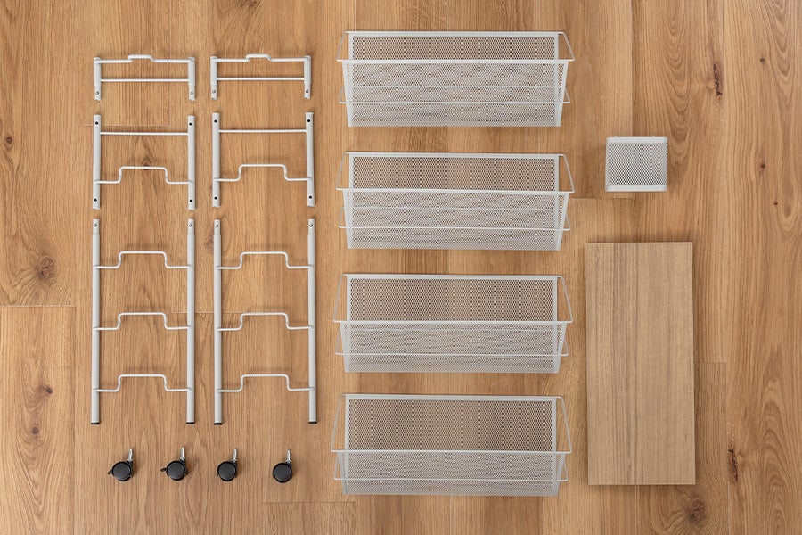 フレームA×2、フレームB×2、フレームC×2、 バスケット×4、天板、小物入れ、キャスターA×2、 キャスターB(ロック付)×2、取扱説明書 |