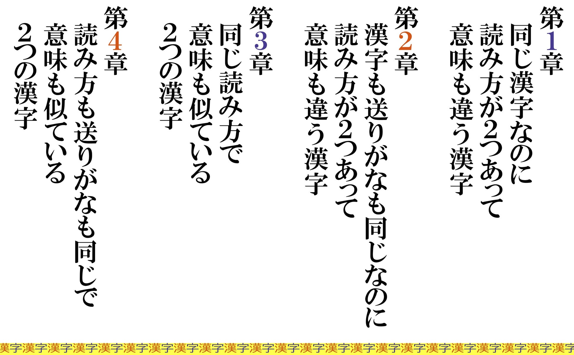 「同じ漢字なのに、読み方が2つあって、意味も違う漢字」「同じ読み方で、意味も似ている2つの漢字」