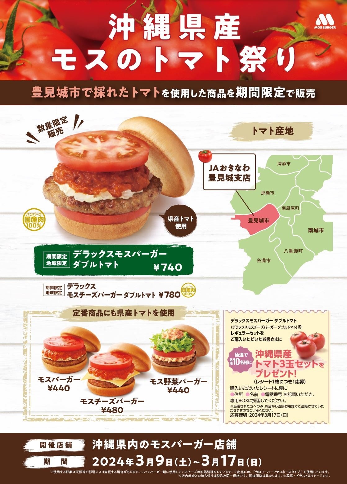また、『沖縄県産モスのトマト祭り』の実施期間限定で、「デラックスモスバーガー ダブルトマト」と「デラックスモスチーズバーガー ダブルトマト」を販売します。この期間だけのジューシーでボリュームたっぷりのハンバーガーをぜひお召し上がりください。さらに、素材のおいしさをそのまま味わっていただくため、『JAおきなわ 豊見城支店』で栽培されたトマトの販売を行うほか、デラックスモスバーガーのセットをご購入いただいた方の中から抽選※1で、県産トマト3玉セットをプレゼントいたします※2。