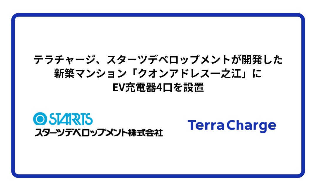EV充電インフラ事業「Terra Charge(テラチャージ)」を展開するTerra Charge 株式会社(本社:東京都港区、代表取締役社長:徳重徹、以下「当社」)は、スターツデベロップメント株式会社(本社:東京都中央区、代表取締役社長:吉永 英太)が開発した、新築マンション「クオンアドレス一之江」の駐車場に3kWのEV充電器4口の設置が完了したことをお知らせいたします。