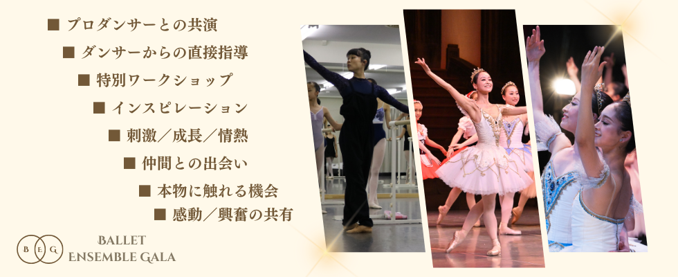 本公演は、国内外で活躍するプロダンサーとプロの世界を目指している未来のプロダンサーたちが共演するバレエ公演です。世界トップクラスのプロダンサーとともに過ごし、日常では得ることのできない刺激や仲間・経験や成長を肌で感じませんか?同じ目標をもった者同士で作る最高のステージを、体感することができます。