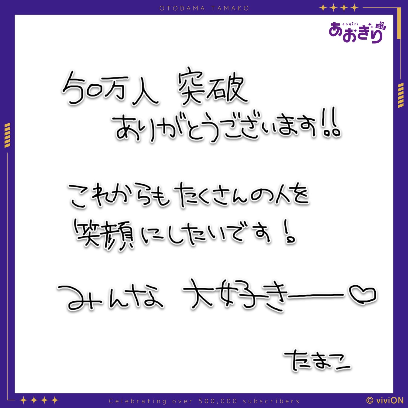 VTuberグループ『あおぎり高校』音霊魂子、YouTubeチャンネル登録者数50万人突破! 直筆コメントを公開
