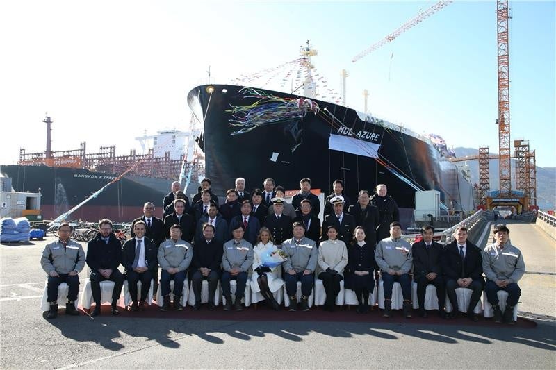 式典には、TOTALのガス・再生可能エネルギー・電力部門の副社長であるCarolina PRETZEL氏をはじめ、多数の関係者が出席し、本船は「MOL AZURE」(読み: エムオーエル・アズール、以下「本船」)と命名されました。本船は1月14日の竣工後、LNG船としては2隻目のTGPLとの定期用船契約に基づき(註1)、最初の積み地であるアメリカに向けて航行を開始します。