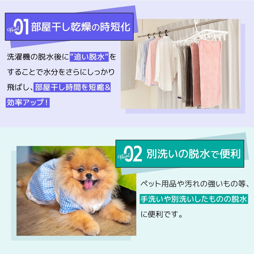 通常の洗濯機で洗った後の“追い脱水”として使えば、乾きにくい衣類の干し時間の短縮にも。