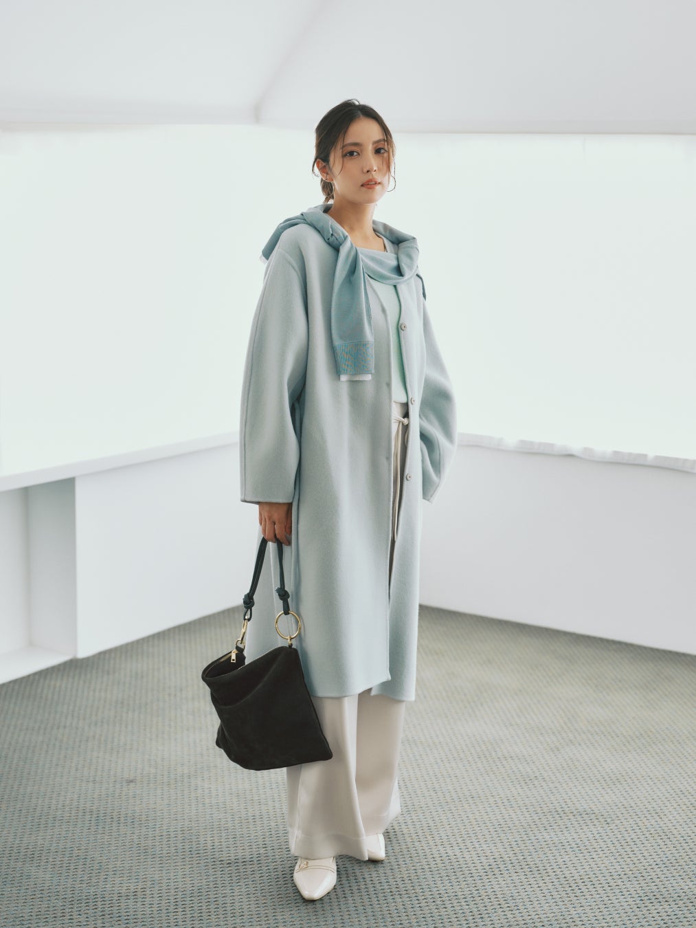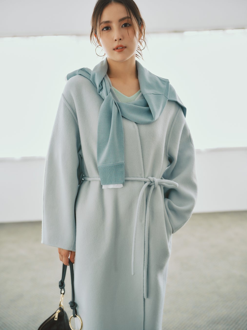 COAT_¥53,900 KNIT(GREEN×OFF)_¥14,300 KNIT(MINT)_¥18,700 PANTS_¥19,800 BAG_¥17,600 SHOES_¥18,700