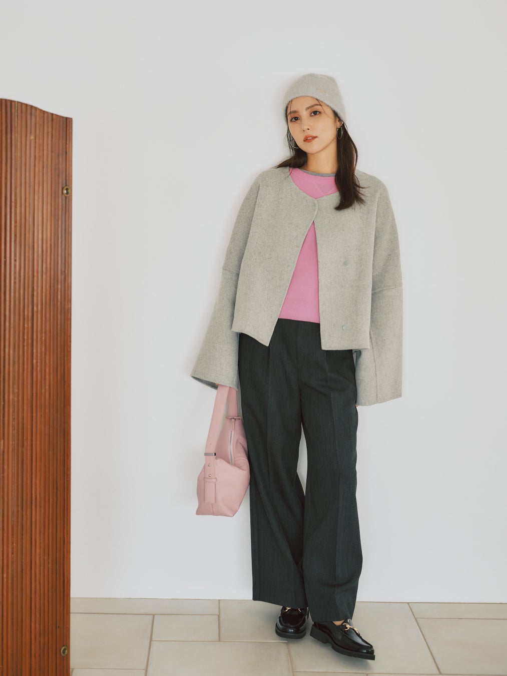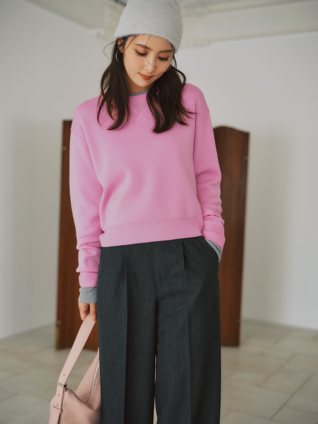 COAT_¥41,800 KNIT(PINK)_¥19,800 KNIT(GRAY)_¥19,800 PANTS_¥18,700 BEANIE_¥8,580 BAG_¥15,400 SHOES_¥23,980