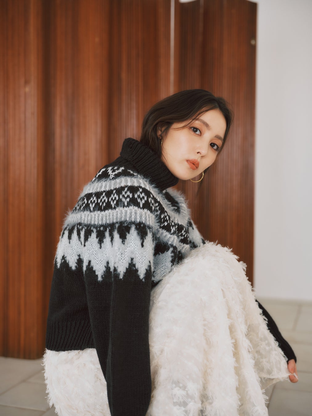 1点投入で冬らしさが漂う柄ニットはジャカードスカートを合わせてレディに