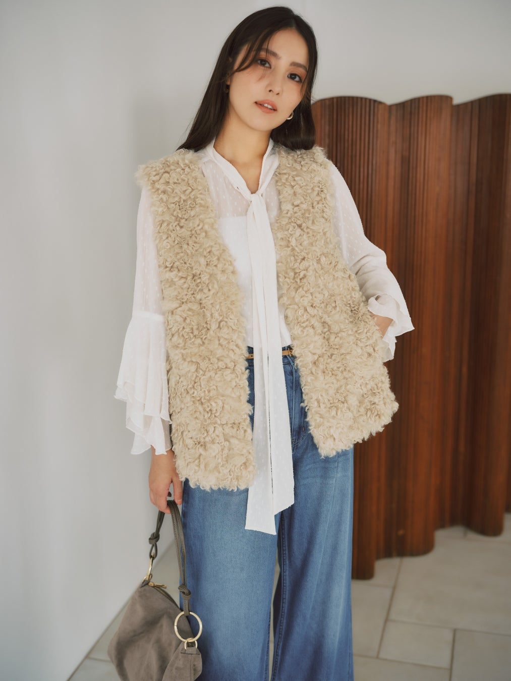 GILET_¥26,400 BLOUSE_¥17,600 PANTS_¥20,900 BELT_¥9,680 BAG_¥17,600 SHOES_¥18,700