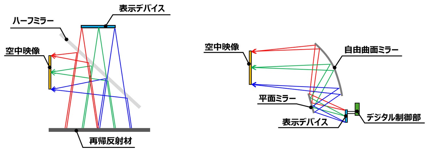 近年、デジタル技術の進展などを背景に、利用者に高い臨場感と没入感を提供できる空中ディスプレイが注目を集めています。空中ディスプレイの多くは、コストの低い再帰反射方式(※2)を採用していますが、光損失の大きい再帰反射材やハーフミラーを使用するため映像が暗く、解像度が低下するため視認性が低いという課題があります。また、等倍光学系(※3)であるため、大きな映像を表示するにはその分大きな表示装置が必要となることから、適用範囲が限られていました。