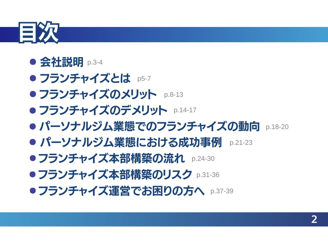 本レポートでは、パーソナルジム経営者向けにフランチャイズの基本的な仕組み、メリットとデメリット、本部を構築する際の流れやリスクについて解説し、フランチャイズビジネスを始めるために必要な情報や注意点を紹介いたします。