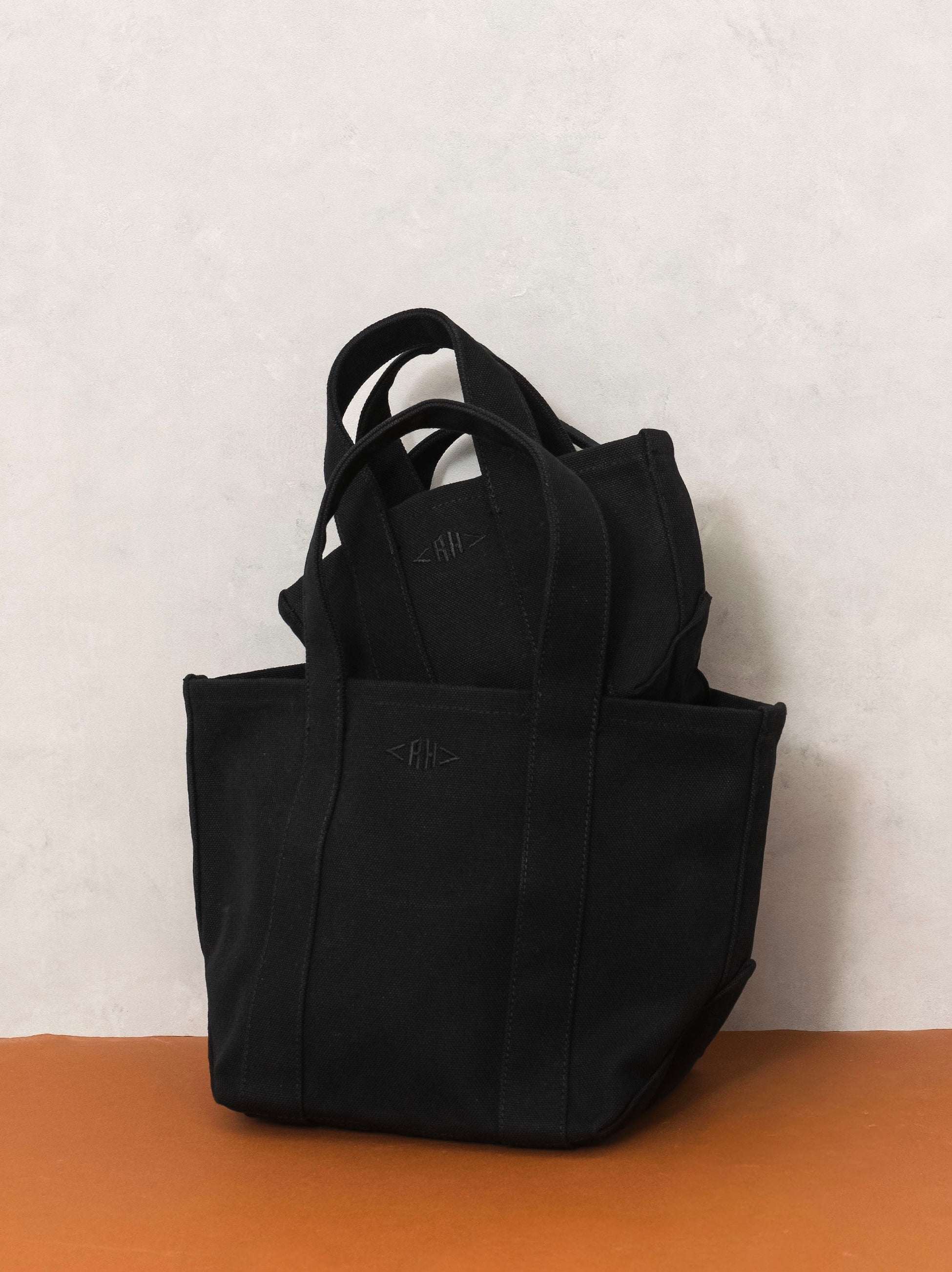 市場ではなかなか出回らない6号のオーガックコットンを使用したオリジナルのトートバッグ。ロンハーマンのために生地から織り上げた地厚なキャンバスで、バッグが自立する仕様です。底マチを真四角に取ったデザインが特徴で、小さいサイズはミニ財布や携帯、ハンカチが入るほどのコンパクトさで、持ったときのコロンとしたフォルムも魅力です。