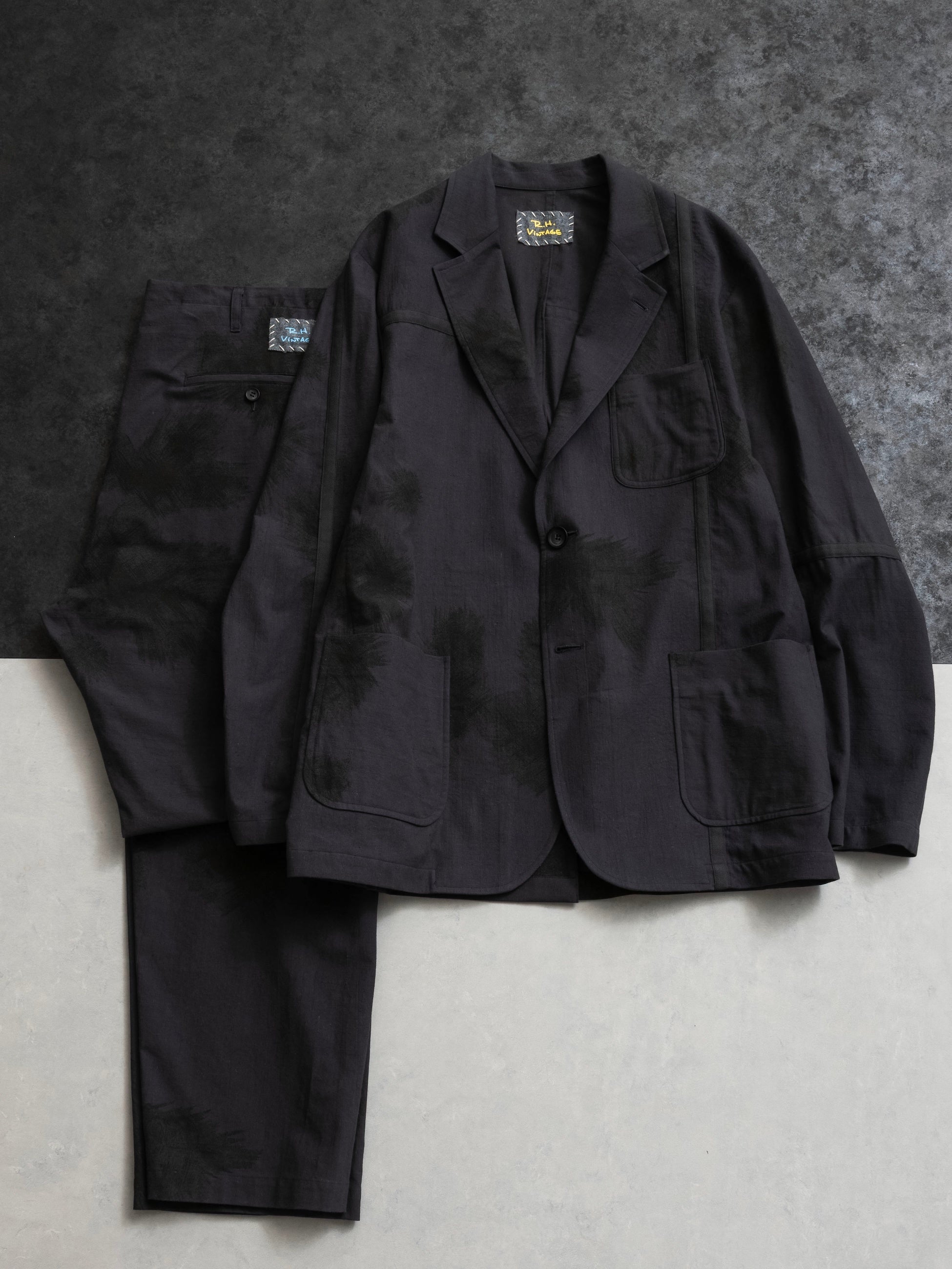 スノーカモジャケットとイージーパンツはブラックのオーバーダイを施し、一枚の布状にしたデッドストックのスノーカモポンチョを使用しています。廃棄問題の解決に取り組む、デジタル技術を研究・開発する企業シンフラックスによる「Algorithmic Couture®(アルゴリズミック・クチュール)」の技術を活用し、限られた生地を最大限に生かす型紙を導き出しました。
