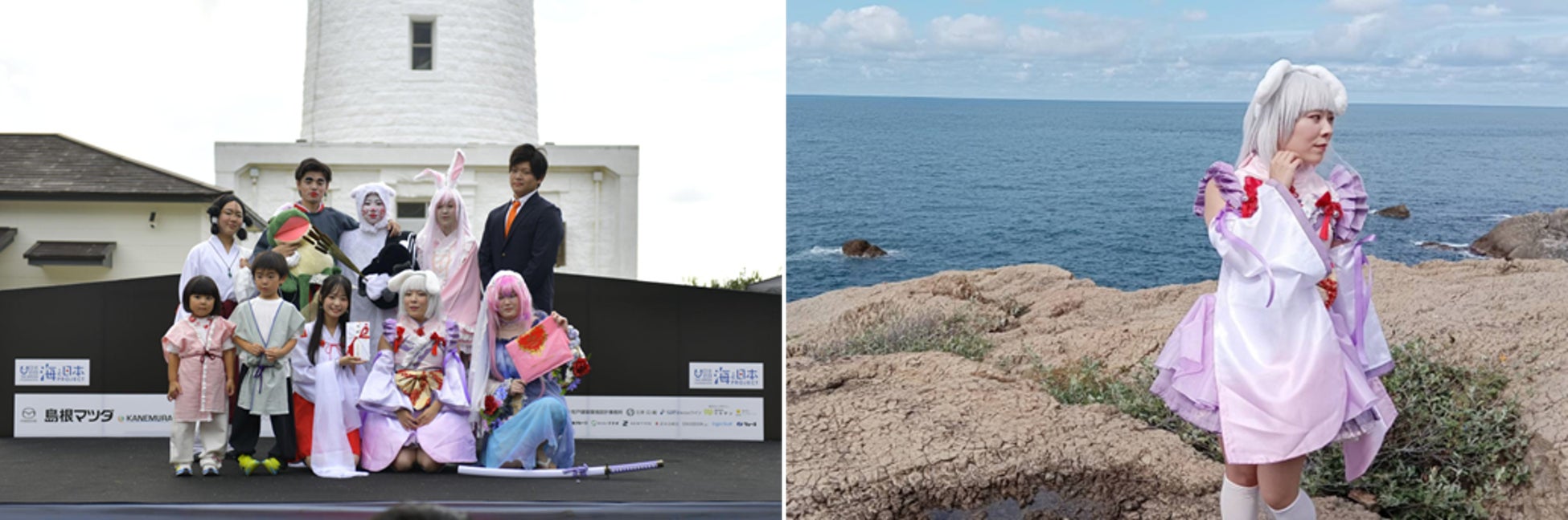 石造り灯台としては日本一の高さを誇る出雲日御碕灯台の麓で初めて開催した神様コスプレコンテスト。県内外から8人出場し、灯台前に設置されたランウェイ&ステージで、自慢の神様コスプレを披露しました。優勝者は出雲の観光ポスターに掲載されるとあって、工夫されたコスプレを次々と披露。優勝したのは出雲市出身の19歳女性でした。コンテストの審査委員長を務めた出雲市出身のコスプレイヤー・なほぽよさんの撮影会も同時開催され、こちらにも10名程が参加し、アマチュアカメラマンとともに、灯台や日本ジオパークにも登録されている景勝地で撮影を楽しみました。