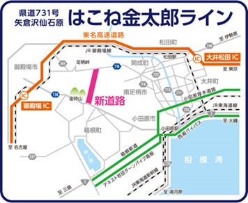 南足柄市と箱根町を連絡する道路(愛称:はこね金太郎ライン)は、南足柄市矢倉沢から箱根町仙石原までの約10.9kmを結ぶ道路で、自然環境への影響を極力少なくするため、大規模な改変は行わず、既存の林道を活用し、県道として乗用車等*1が安全に通行できるよう整備を進めてきました。今回の開通により、新たな道路ネットワークが構築され、災害時の代替ルートになるとともに、県西地域の観光振興をはじめとする地域活性化が期待されます