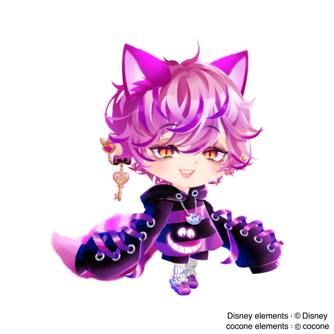 『ポケコロツイン』のイベントでは、ディズニー映画『ふしぎの国のアリス』のアリスとチェシャ猫をメインモチーフにしつつ、アミューズメントパーク風のシチュエーションで仕立てた企画となっています。色が変化するヘアスタイルやぴょこぴょこ動く猫耳アクセサリーなど、『ふしぎの国のアリス』の個性的な物語を表現した様々なファッションアイテムを展開。今までにない不思議な国の世界をお楽しみいただけます。