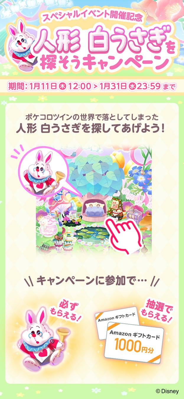 この度開催する第2弾はその勢いのままに、『ポケコロ』で「ミッキーマウス」&「ミニーマウス」、『ポケコロツイン』でディズニー映画『ふしぎの国のアリス』をテーマにしたイベントや限定アイテムを展開します。