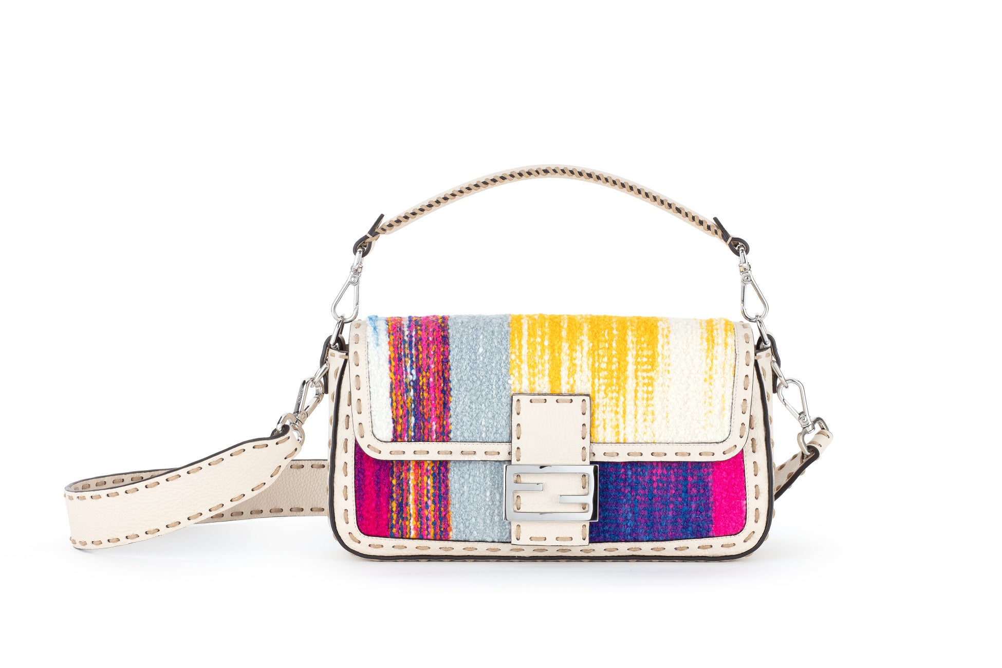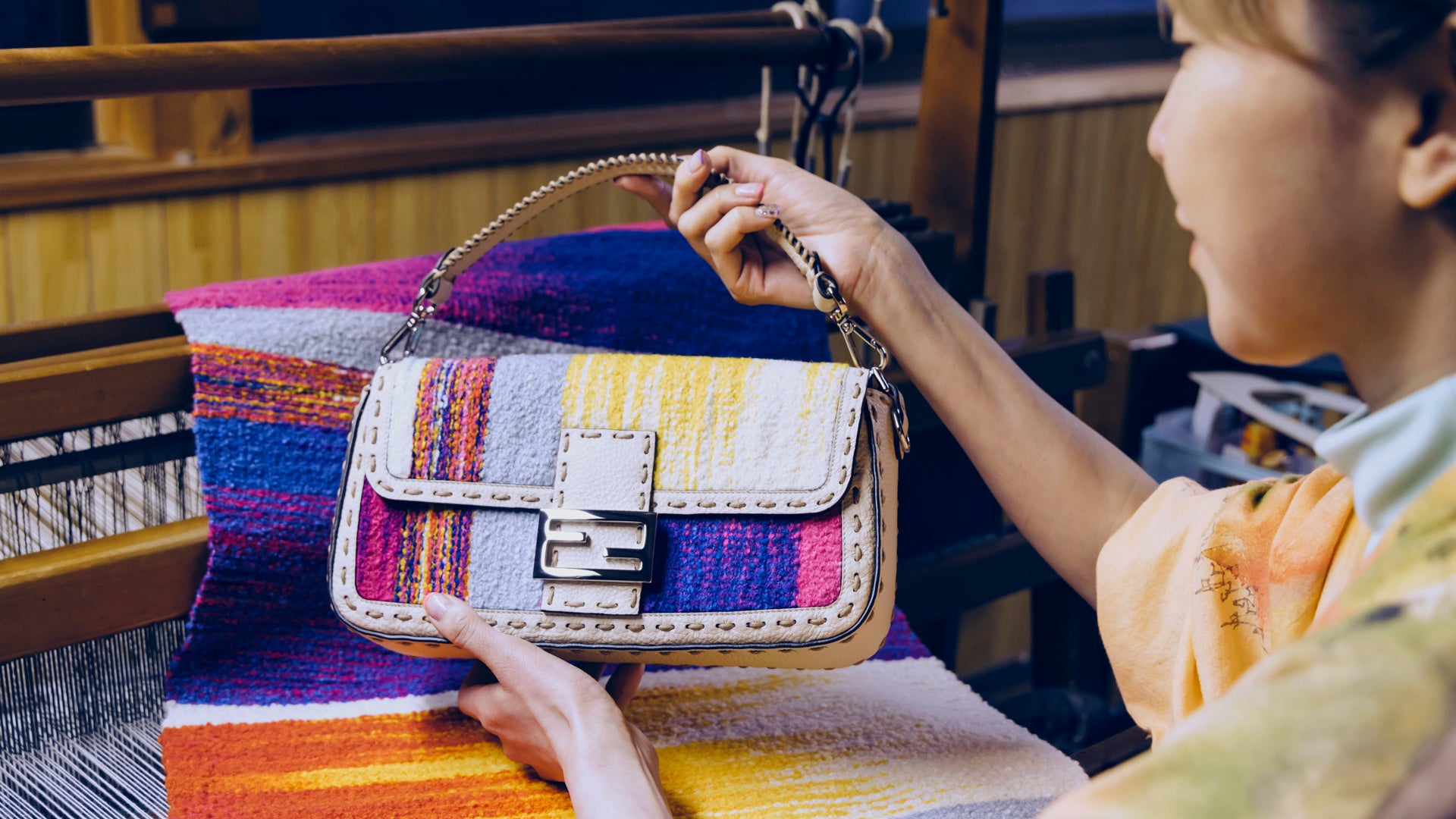 「にしかた染織工房」の4代目である西形彩は、栃木県伝統工芸士である両親から染織基礎を受け継ぎ、自身にしか出すことができない唯一無二の色彩表現を追求し続けています。この「バゲット」は、紺、紫、桃、橙、黄、鼠色、無色といった鮮やかな色彩の手染めウール糸を使用し、手織りによって複雑で多彩なトーンを表現しています。綴れ織りで仕上げ、色の濃淡とデザインの緻密さを高めています。バッグの側面とハンドルには、ミルク色の「クオイオ ローマ」レザーに、フェンディのアイコンである「セレリア」のマクロステッチが施され、シルバーメタルの「FF」バックルと金具のディテールを組み合わせています。