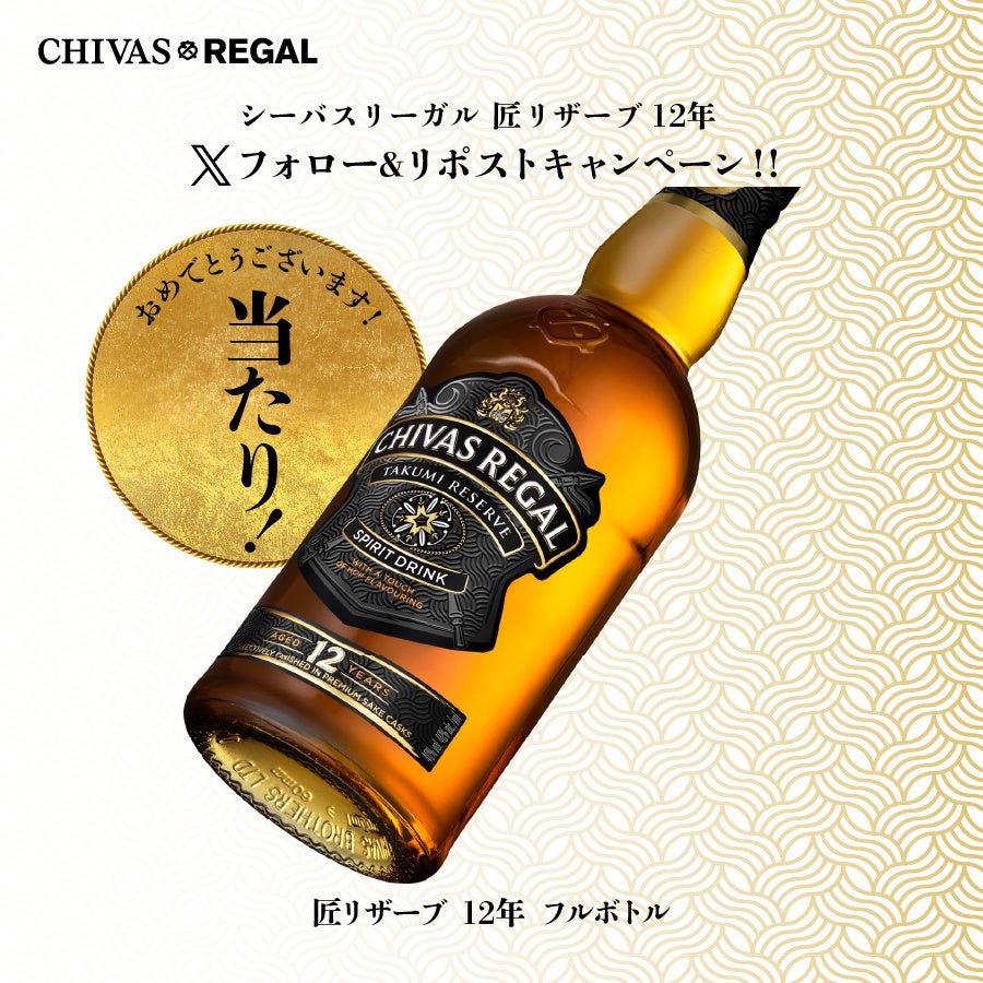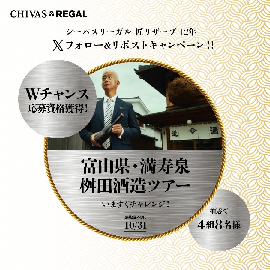 2024年9月24日(火)から10月31日(木)の期間、「シーバスリーガル」公式Xアカウント(@ChivasRegalJP)にてフォロー&リポストキャンペーンを開催。抽選で毎日1名様に『シーバスリーガル 匠リザーブ 12年』の700mlボトルが当たります。さらにWチャンスとして、外れた方の中から抽選で4組8名様を「富山県 満寿泉/桝田酒造店1Dayツアー」にご招待します。
