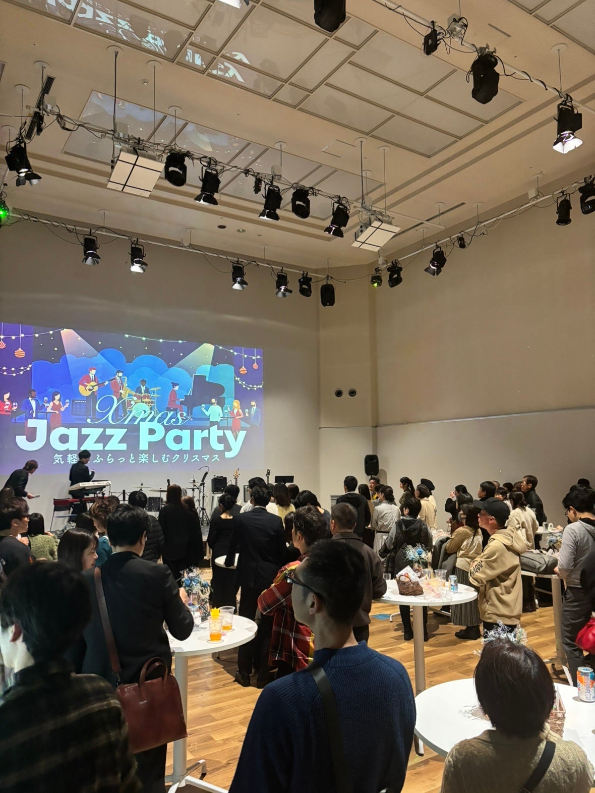 会場では、照明と映像演出の中で本格的なジャズライブが行われ、参加者の皆さまはビール・ワイン・ソフトドリンクなどのフリードリンクや軽食を片手に、思い思いのスタイルで音楽を楽しまれていました。
