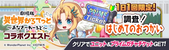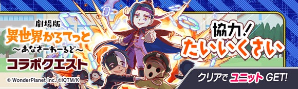 エンターテインメントサービス事業を行うワンダープラネット株式会社(本社:愛知県名古屋市、代表取締役社長CEO:常川友樹、東証グロース:証券コード4199、以下当社)は、iOS/Android端末向けに配信中のスマートフォンゲーム『クラッシュフィーバー』において『劇場版 異世界かるてっと ~あなざーわーるど~』とのコラボイベントの実施を決定したことをお知らせいたします。