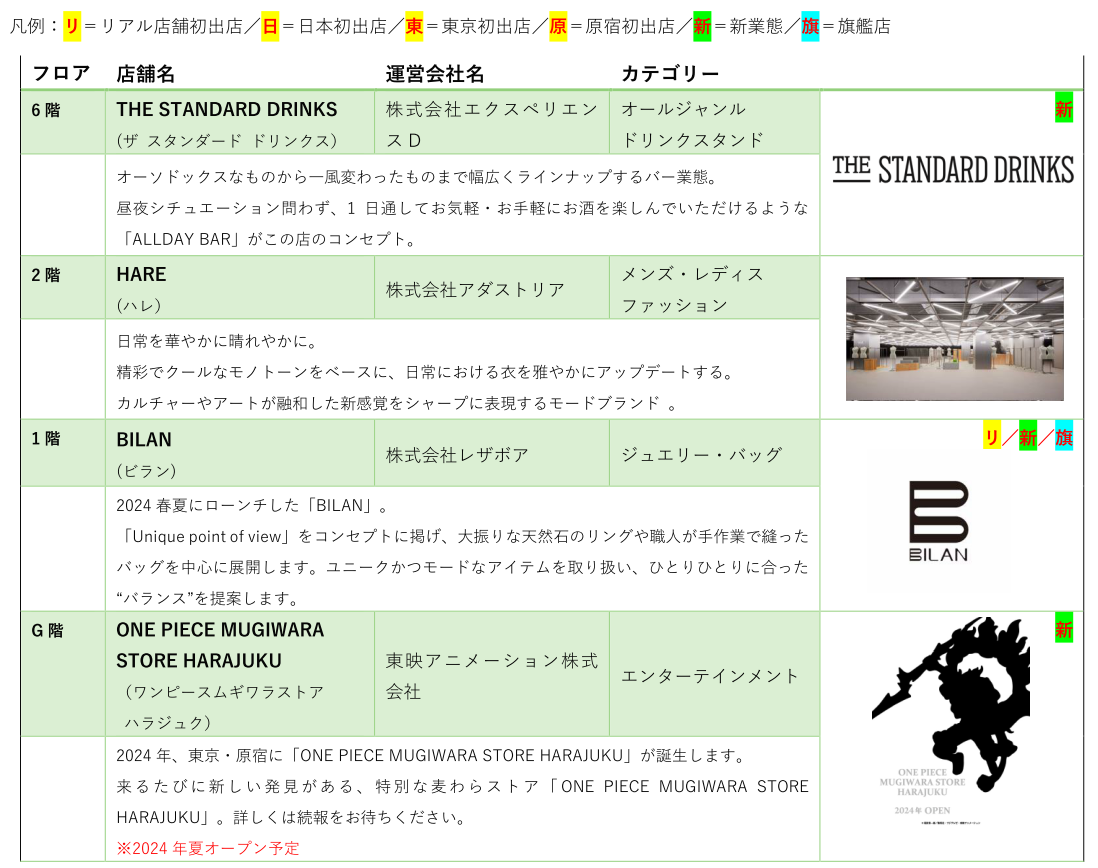 これまでに発表した店舗に加え、新たに4店舗が開業することを発表いたします。6階には、1日を通して気軽にお酒を楽しめるバー業態の「THE STANDARD DRINKS」がオープン。他飲食店舗とのクロスオーダーで、食事にあったお酒やドリンクを楽しめます。2階には、カルチャーやアートが融和した新感覚をシャープに表現するモードブランド「HARE」が、1階には人気ファッションブランド「led.tokyo」などを運営する株式会社レザボアが2024春夏に新たにローンチしたジュエリー・バッグブランド「BILAN」の初の旗艦店がオープンします。また、今夏には、来るたびに新しい発見がある、特別な麦わらストア「ONE PIECE MUGIWARA STORE HARAJUKU」がG階に誕生します。