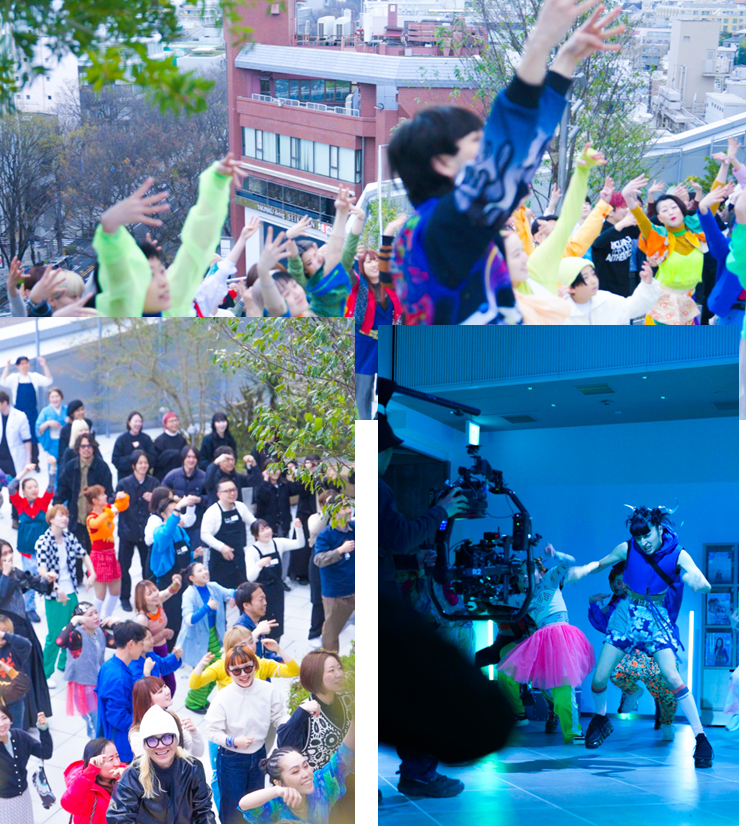 「ハラカド」開業コンテンツとして、総勢約300人のスタッフやクリエイターとともに約40時間にわたる撮影を実施し、開業前の全館を活用したショートフィルムを制作。音楽ユニット「水曜日のカンパネラ」が「ハラカド」開業を記念して特別に制作した『四天王』をバックに、ボーカルの詩羽さんが主演を務めるショートフィルムが完成しました。ショートフィルムには、様々な分野で活躍するアーティスト、ダンサーに加え、次世代のカルチャーを担う学生や、「ハラカド」に入居するテナント従業員約100人も出演し、ともにコンテンツ制作に取り組みました。ショートフィルムは開業日の2024年4月17日(水)に「ハラカド」屋上に設置するモニターと同時に「オモカドビジョン」で30秒素材が公開され、今後長尺のフルバージョンも公開予定です。「水曜日のカンパネラ」の歌と「ハラカド」が生み出しているカルチャーをミックスした世界観に彩られたショートフィルムは、撮影日当日、開業前の「ハラカド」を味わうことができる貴重な映像です。撮影現場の雰囲気や裏側の興奮を来館いただく皆様と共有し、まるで撮影に参加したような体験を提供します。