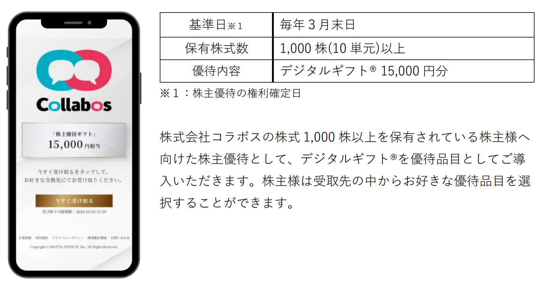 株式会社コラボス(代表取締役社長:茂木 貴雄、東証グロース:証券コード 3908)において、株式会社デジタルプラス(代表取締役社長:菊池 誠晃、本社:東京都渋谷区、東証グロース市場:証券コード3691)グループが運営する「デジタルギフト®」を株主優待としてご活用いただくことになりました。