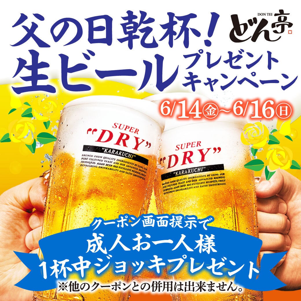 ご注文時に下記クーポンをご提示でグループ内の20歳以上の方全員に「生ビール中ジョッキ1杯」をプレゼントいたします。お仕事終わりや週末のご家族でのお食事会などにぜひご利用ください。