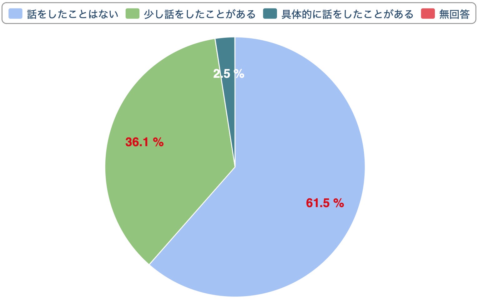 ママたちの6割が親の介護に不安を持っているものの、具体的な介護に関して親と話をしたことがあるママたちは、ほんの2.5%しかおらず、6割以上のママたちは介護について親と話をしたことがないという結果でした。介護の問題については、不安はあるものの、多くの家庭では、なかなか親とは話がしづらい状況だということがわかります。