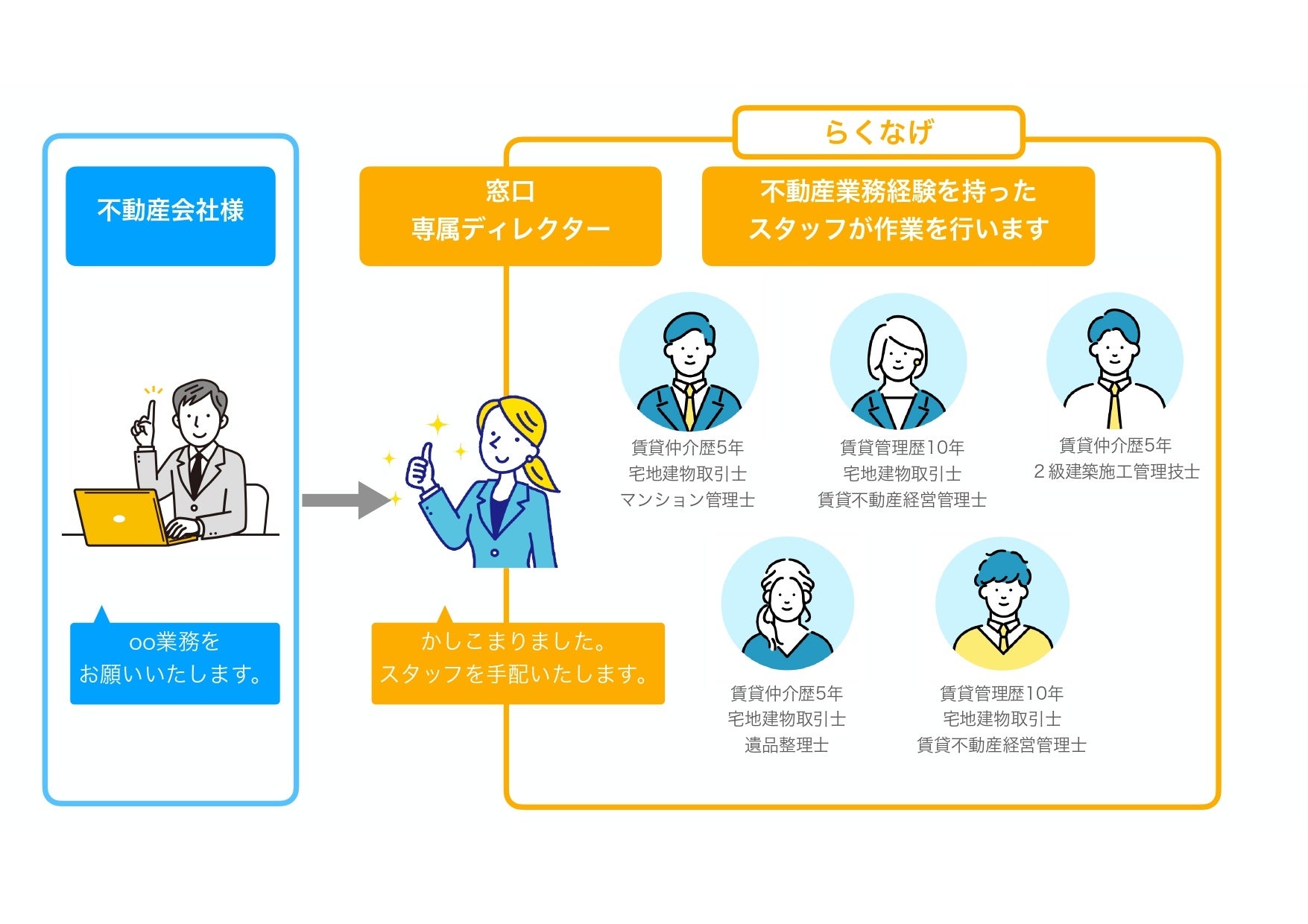 不動産業界の人材不足を解消する為、経験豊富な賃貸管理アシスタントが煩雑な業務を徹底サポートするBPOサービス「らくなげ」を提供しています。