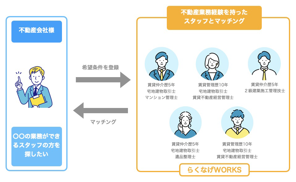 「らくなげ」は不動産業務専門のBPOサービスです。本サービスの利用により、不動産会社では人手不足・繁忙期の業務過多を解消し、コア業務への集中が可能となります。また、業務負荷を理由とする採用・退職リスクも解消できます。